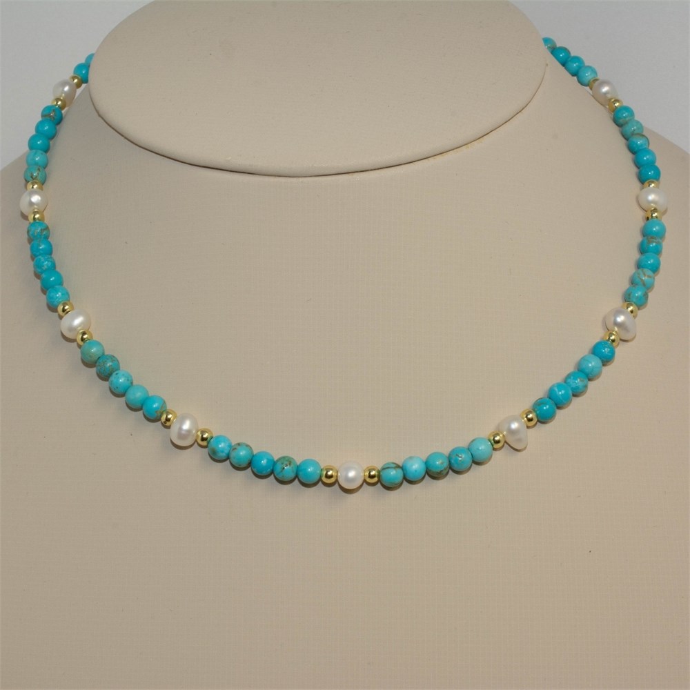 Чокер из бирюзы с жемчугом. Размер жемчужин 5-6 мм, бусин бирюзы - 4 мм.