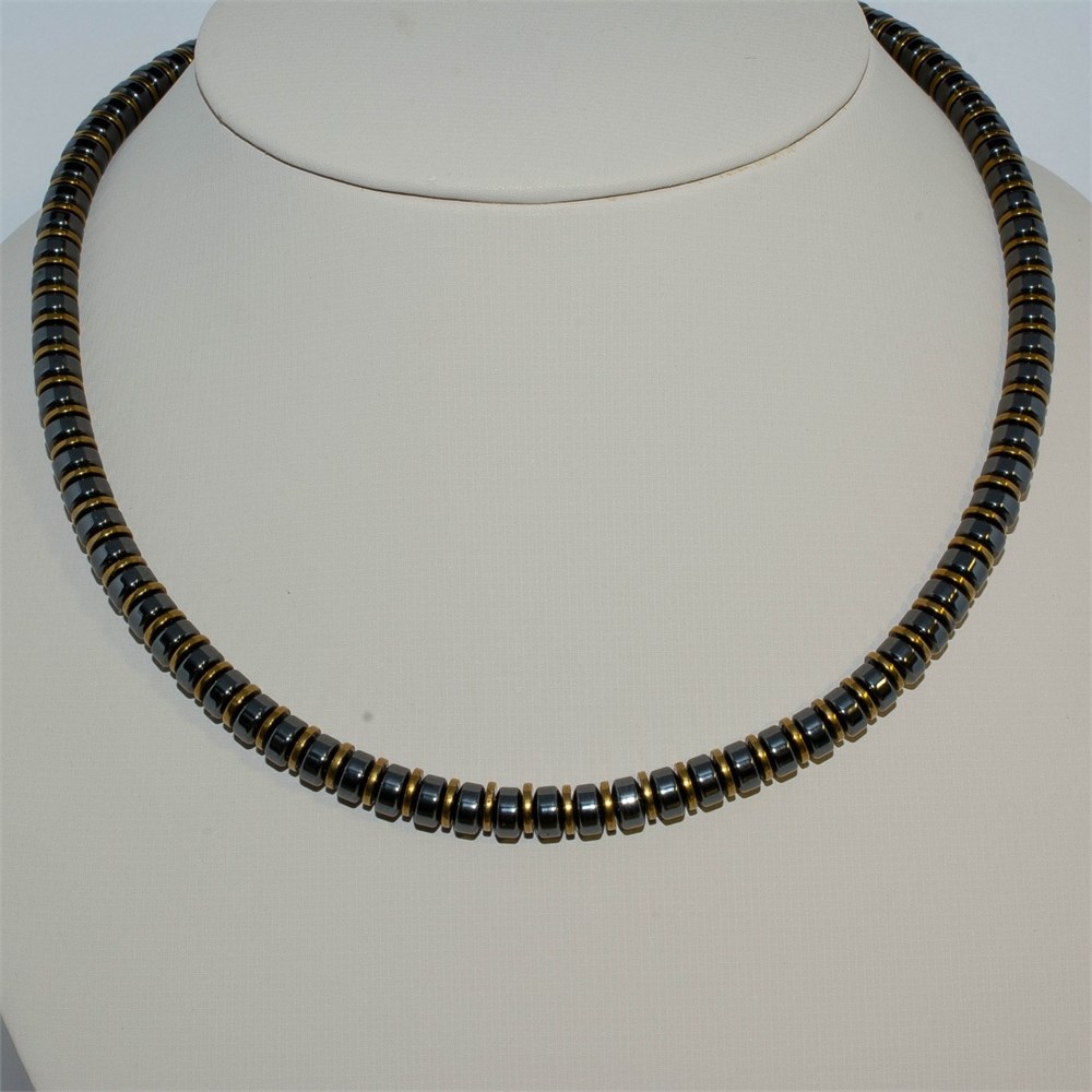 Украшение на шею из бусин гематита натуральной окраски и дисков гематита с покрытием под золото или под серебро. Диаметр бусин 6 мм.
