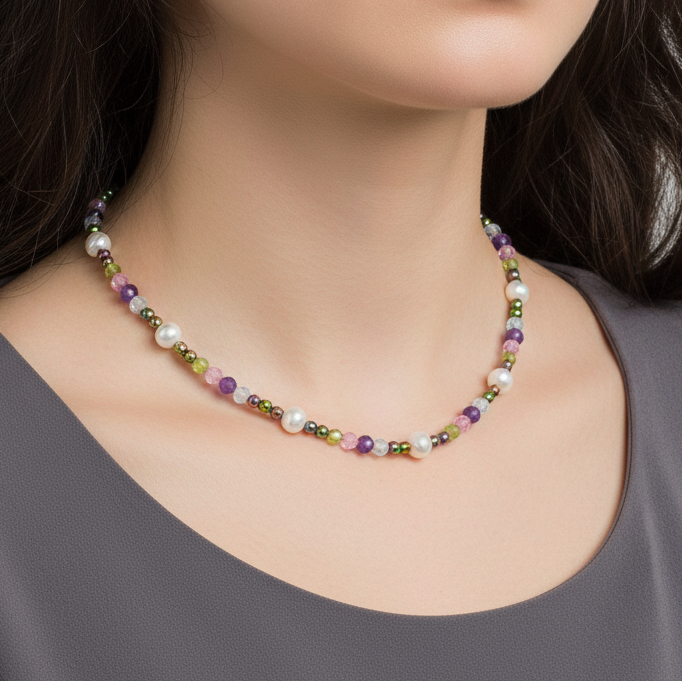 Чокер из бусин топаза, аметиста, циркона, хризолита, жемчуга и гематита с розово-зеленым металлизированным покрытием. Размер бусин 4 мм, жемчужины 5-6 мм. Собран на прочном ювелирном тросике с качественной фурнитурой производства Южной Кореи. Фурнитура с покрытием под золото или под серебро.