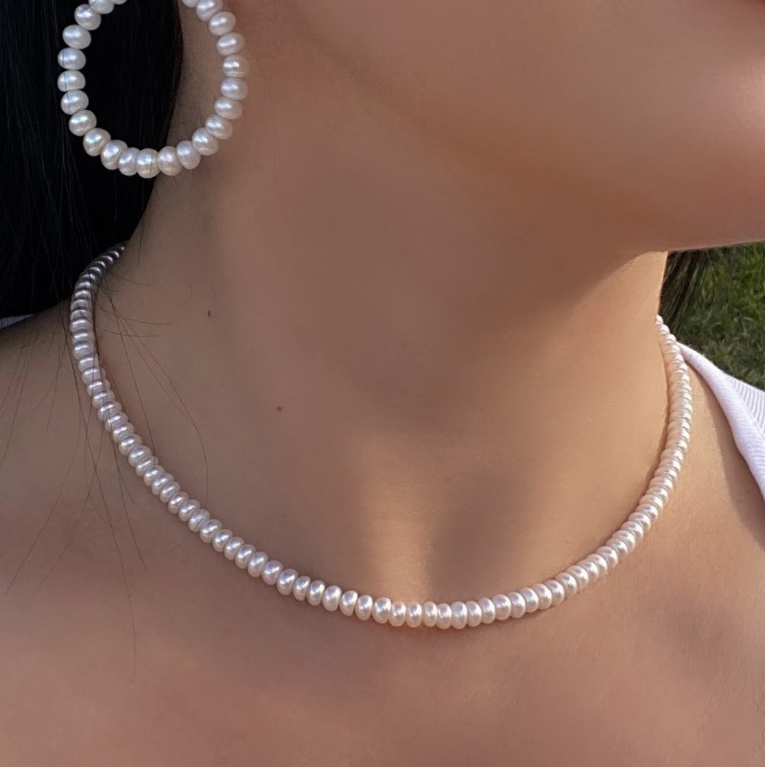 Колье-Чокер из натурального барочного жемчуга класса АА. Жемчужины-рондели формы "кукуруза" размером около 5х6 мм. Каждая жемчужина в украшении уникальна.