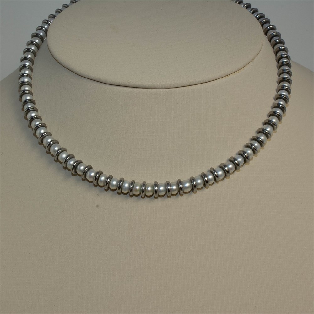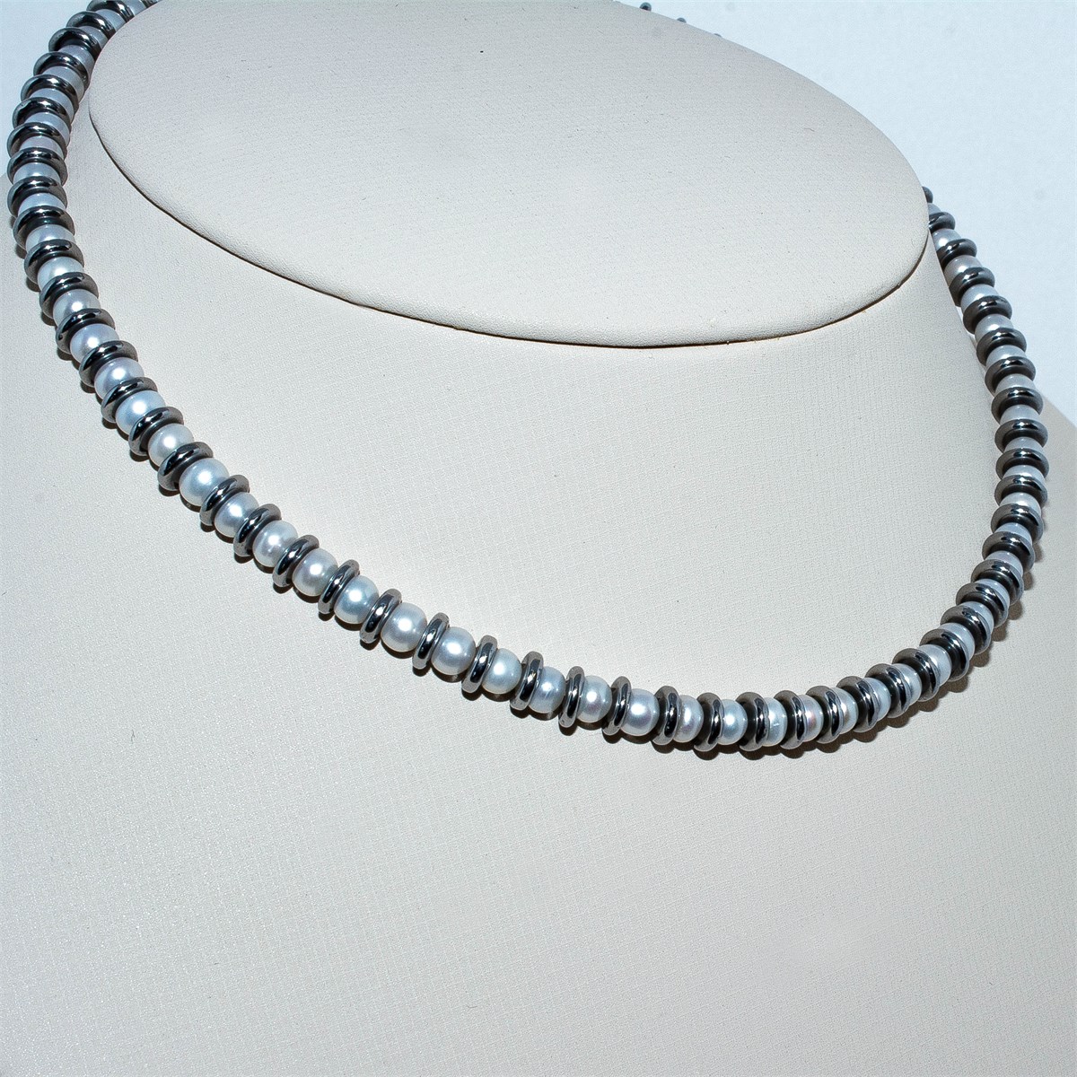 Украшение на шею из натуральных барочных жемчужин с дисками металлизированного гематита. Необычный жемчуг в форме полусфер встречается довольно редко на нитках жемчуга другой формы. Мы отбираем его вручную для оригинальных изделий. Каждая жемчужина в колье уникальна. Размер жемчужин около 5 мм, гематита 6 мм.
