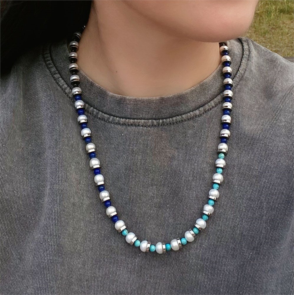Колье на шею из натурального жемчуга, бусин лазурита, бирюзы, черного агата и гематита.