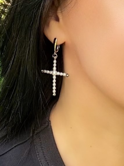 Серьги из барочного жемчуга очень хорошего качества. Диаметр жемчужин около 3 мм, центральная - 4х5 мм. Размер крестика по жемчугу 3х4 см, общая высота со швензой (тн "английский замок") 5.5 см. Качественная южнокорейская фурнитура под золото или под серебро. В комплект или отдельно можно сделать подвеску, возможно изготовление одной серьги или асимметричного комплекта.