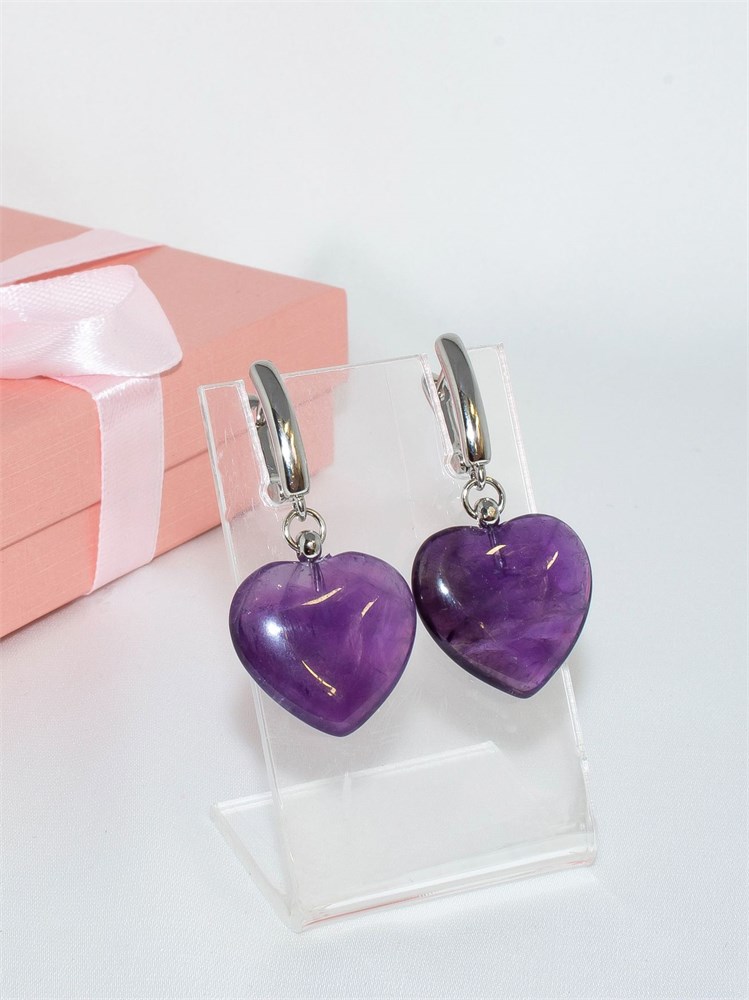 Серьги из натурального аметиста в форме сердца. Размеры сердечка 2х2 см, общая высота серьги 4 см. Качественная фурнитура производства Южной Кореи с гипоаллергенным покрытием под золото или под серебро.